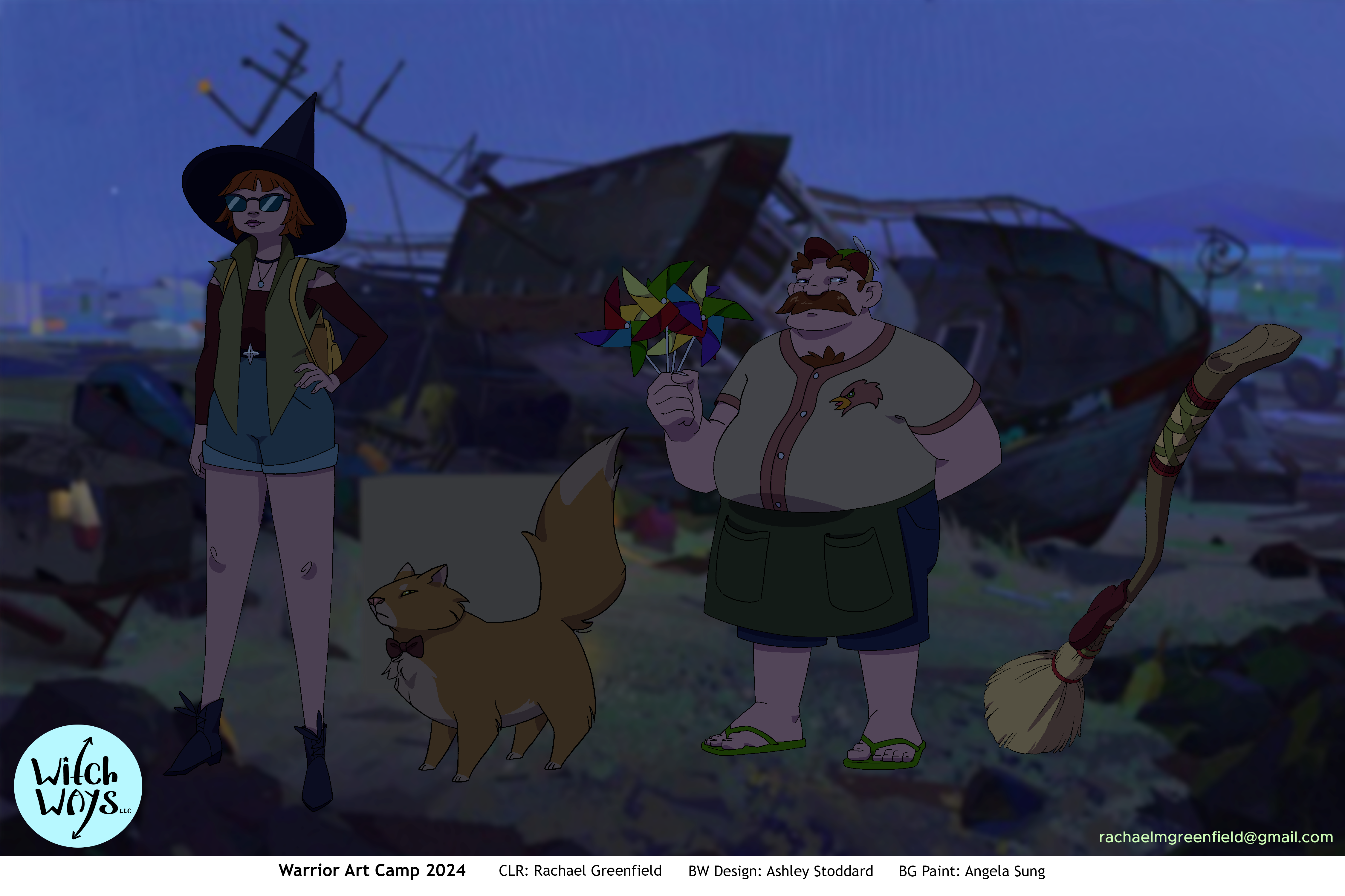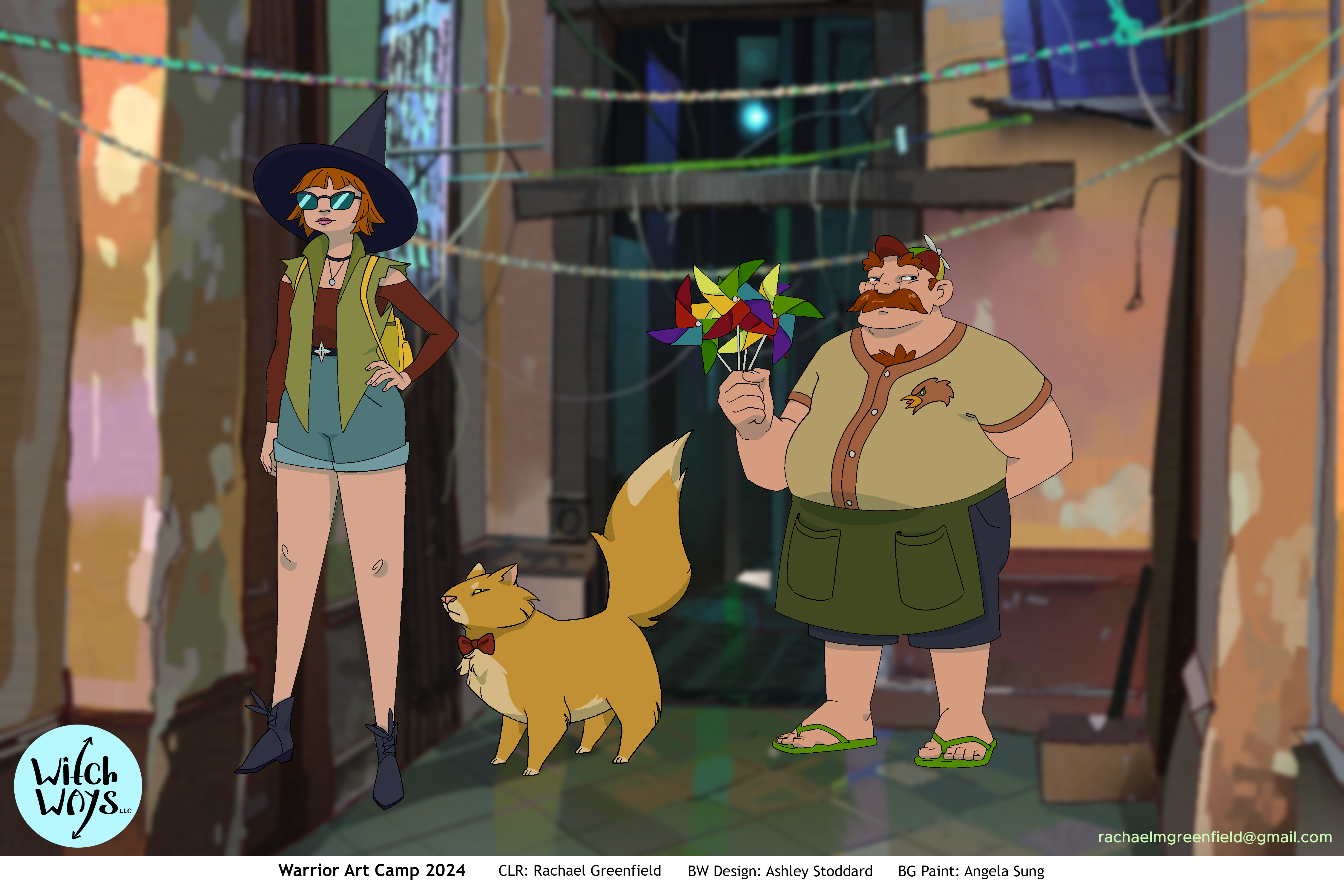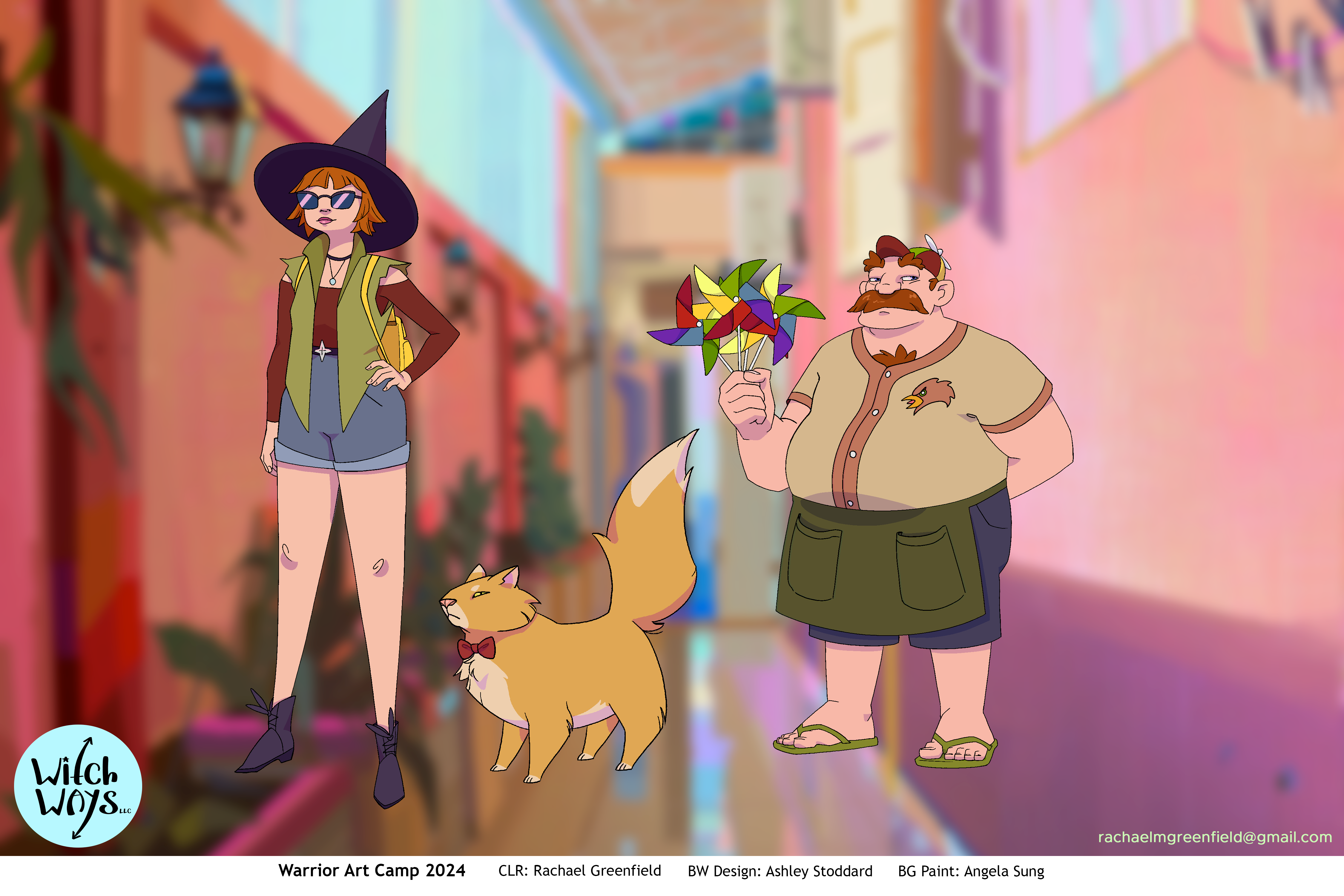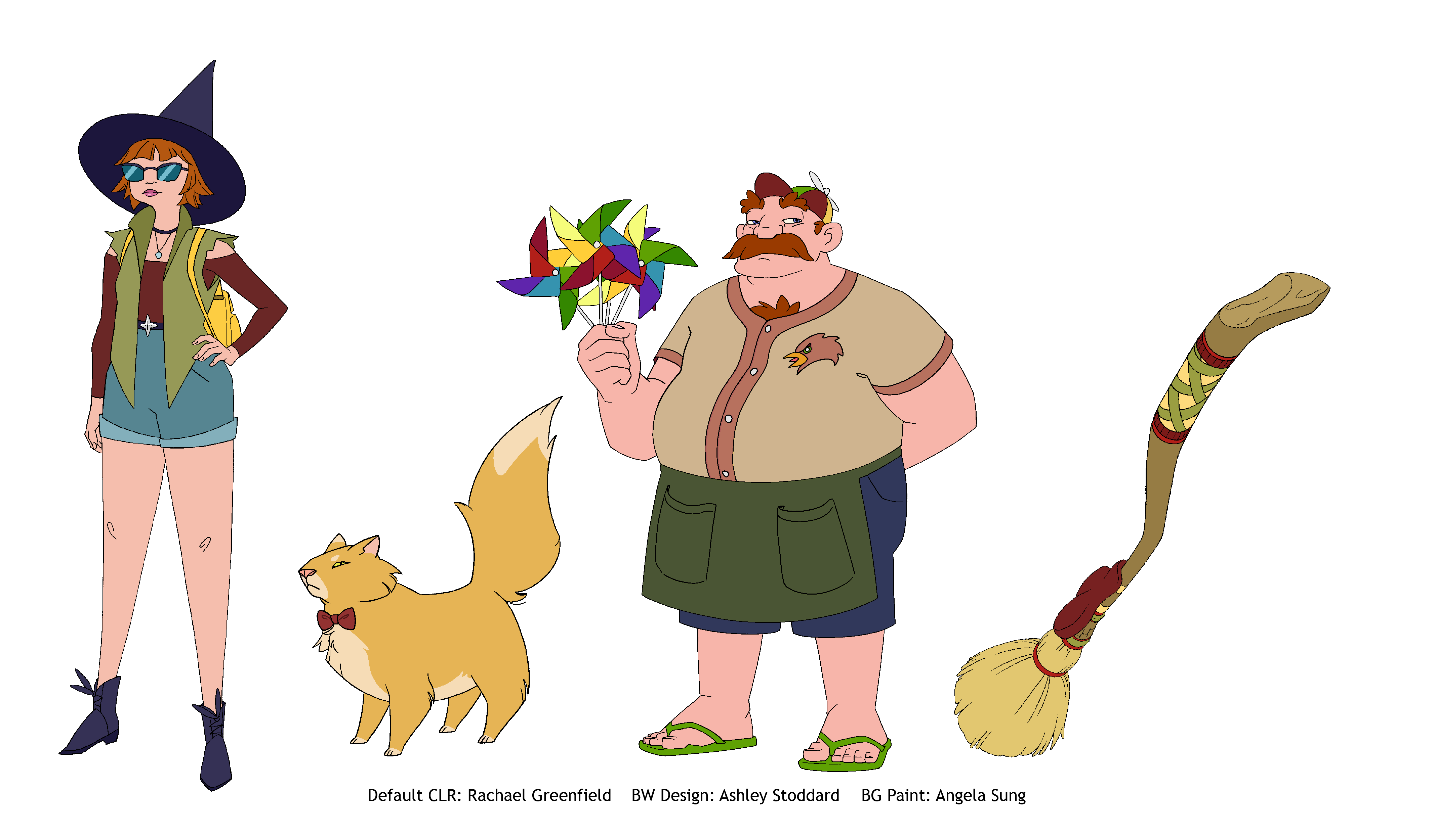 Line art for Character and Prop designs provided by Ashley Stoddard, and Background paintings provided by Angela Sung.